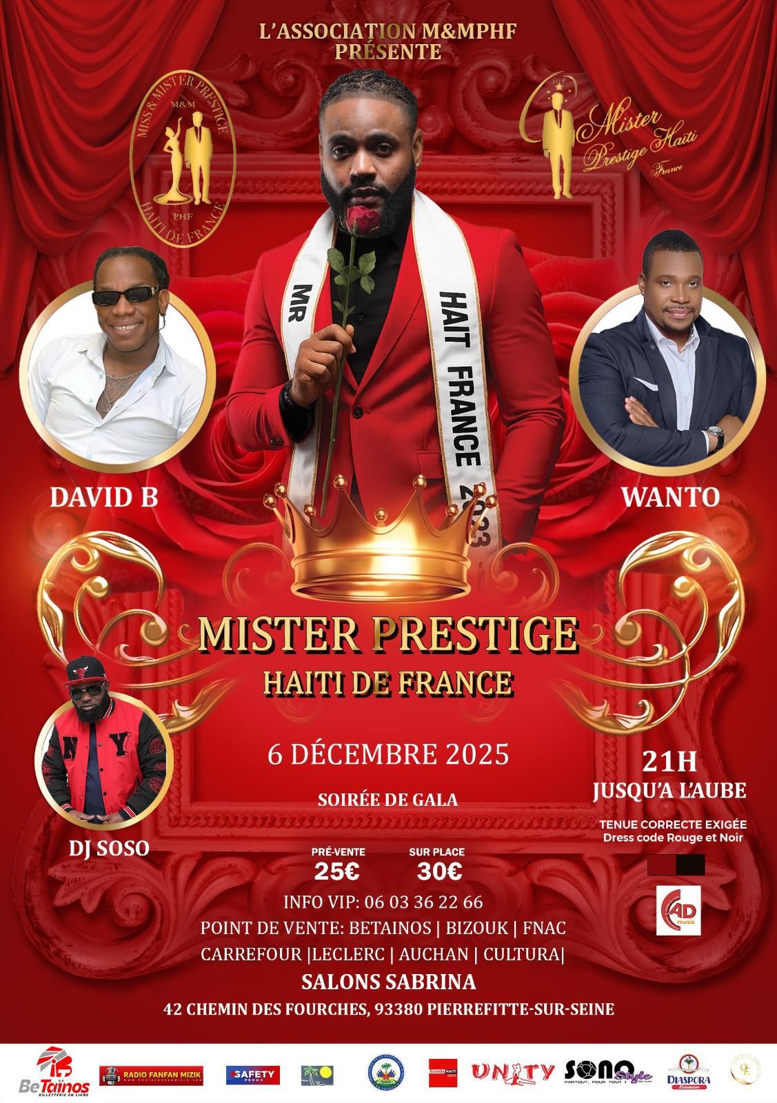 Votre rendez-vous annuel est de retour ! Le 6 décembre 2025, la Salle Sabrina à Stains (93) vibrera au rythme de l’élégance masculine haïtienne. Préparez-vous à vivre une soirée d’exception : l’élection de MISTER PRESTIGE HAÏTI DE FRANCE 2025 Charme, prestance et fierté seront à l’honneur. Qui sera le prochain Mister Prestige Haïti France 2025 ? Un événement où la culture, l’émotion et la distinction se rencontrent pour célébrer la beauté et l’excellence de la diaspora haïtienne. Une soirée à ne pas manquer ! Rendez-vous le 6 décembre 2025 à la Salle Sabrina, Stains (93) ____ Info line : +33 6 03 36 22 66 Plus d’infos : Visitez nos réseaux sociaux sur Facebook et Instagram